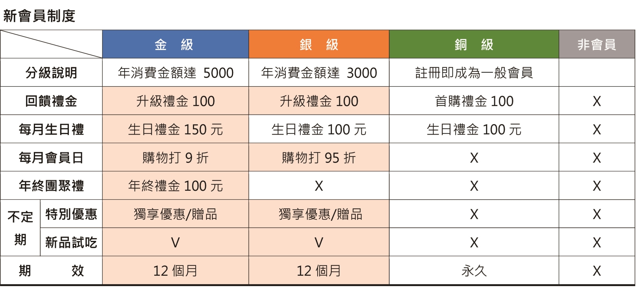 2019年11月7日起,會員制度將全面升級!依累積消費金額分為「銅、銀、金級」會員。請放心,新制是建立在現有的會員優惠上,升級後不會影響到原有權益。每個里程碑,我們都精心準備專屬的禮金與好康,獻給一路相伴的你 :)