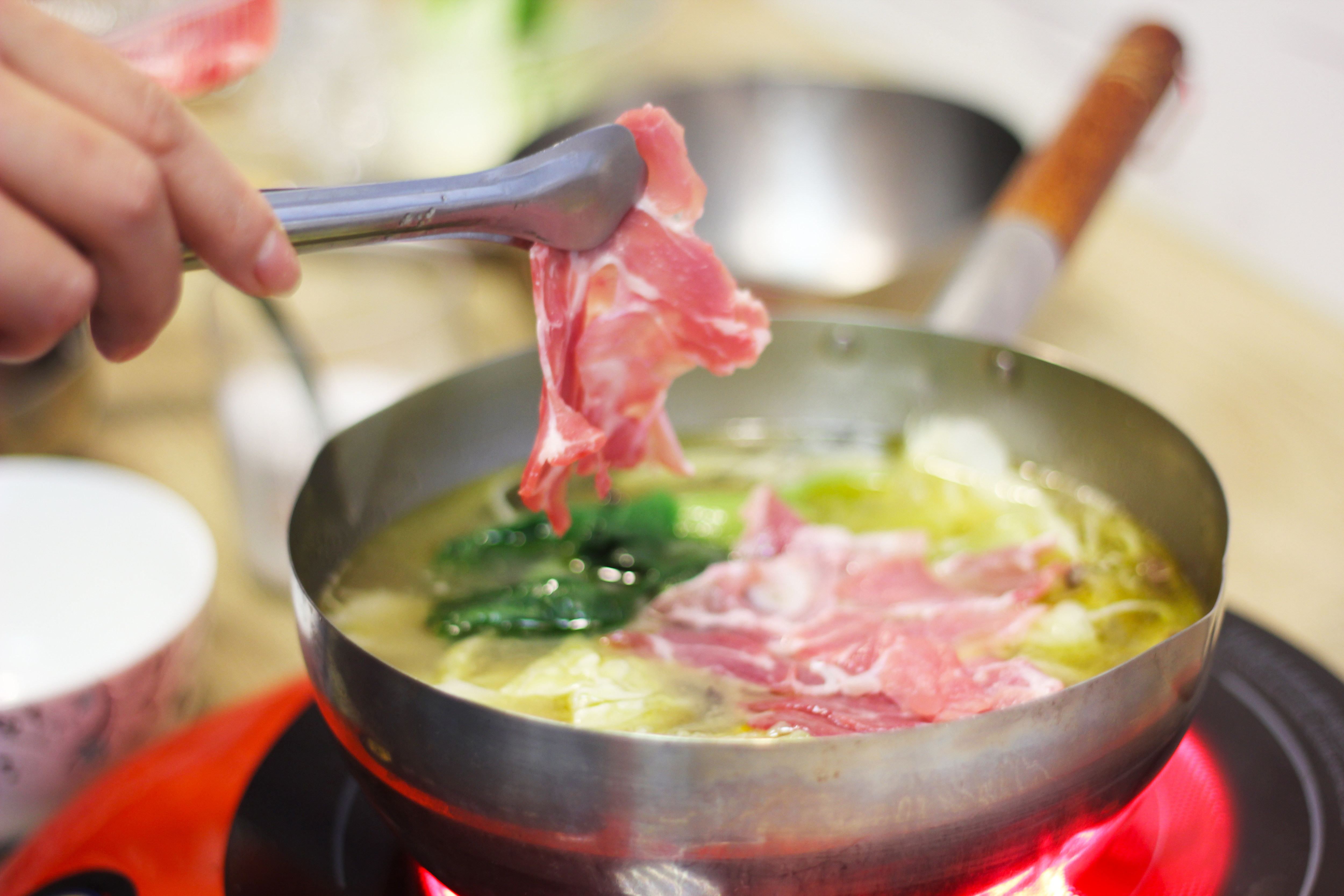 材料:昆布豚骨湯、肉片、金針菇、香菇、玉米、白菜、青江菜(材料可依個人喜好調整)