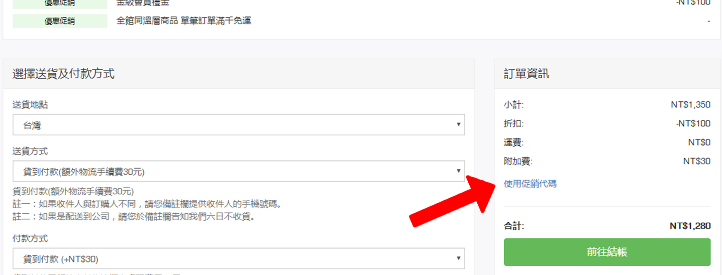 前往結帳頁面 > 至訂單資訊處,點擊「使用促銷代碼」輸入優惠代碼。