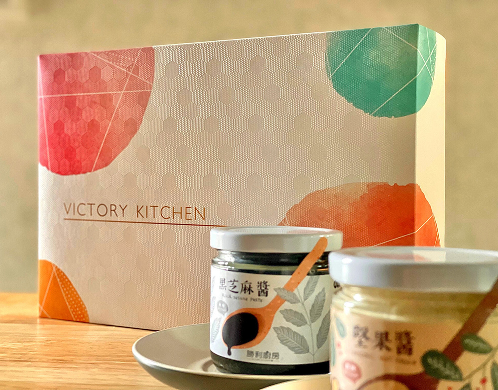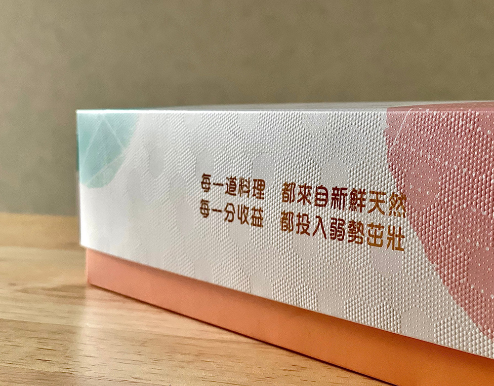 勝利廚房的春悅禮盒,圖面以點線面組成的斑斕渲染色塊,象徵著身障團隊由小集結成的美好和諧,以及共好共融、源源不絕的進步動力。同時,選用壓紋工藝,為禮盒增添靈動的生命力與細節質感!壓紋紙面的獨特觸感,也能讓收禮人手接到禮盒的第一瞬間,感受到備禮者的用心。