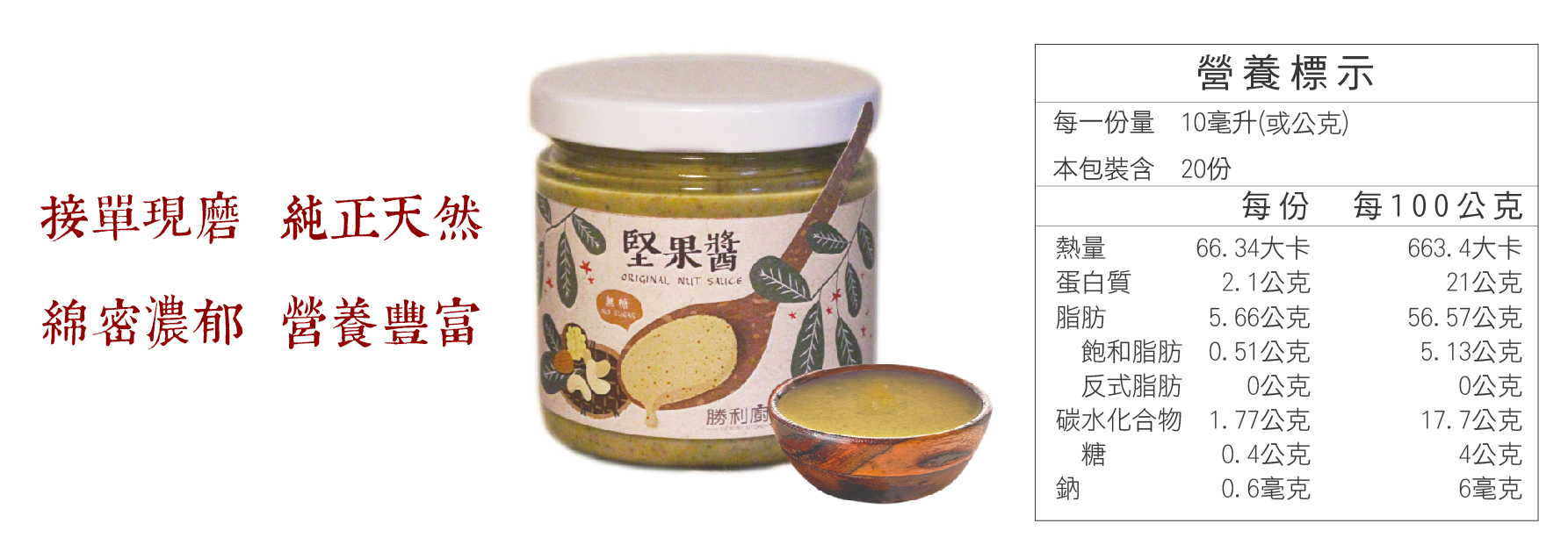 勝利廚房的特製堅果醬在HACCP高潔淨度下的環境下製作,安全衛生,採計劃性生產,新鮮現磨不囤貨,讓客人接到手中的是最新鮮的好風味。堅果醬用途廣泛,塗抹麵包鬆餅、拌麵拌稀飯、淋沙拉、冰淇淋,或是調製飲料及各種風味醬,都很適合。純天然的堅果醬無添加防腐劑、乳化劑,開瓶後建議冷藏,並盡早食用完畢。全素可食。